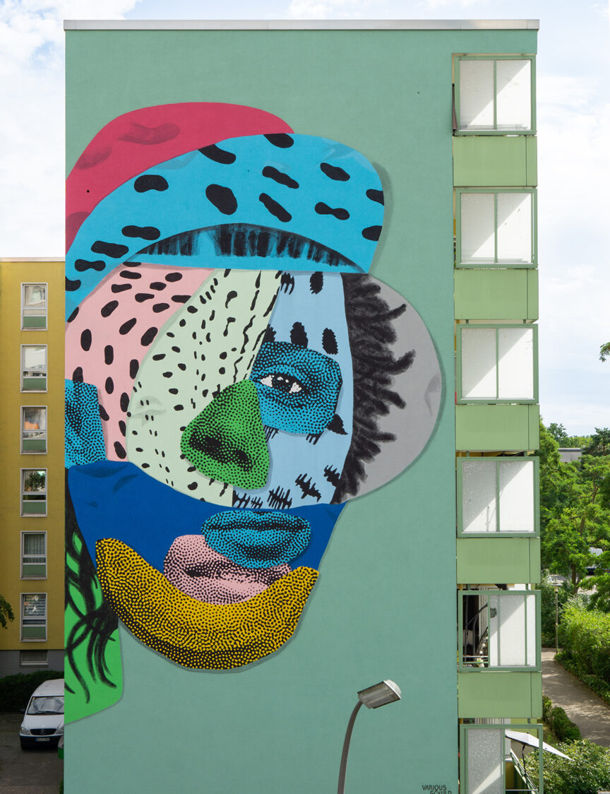 Mural on ca. 146 m² in Berlin-Staaken, 2023. The full title translates roughly as: “We all here belong to the community”.
