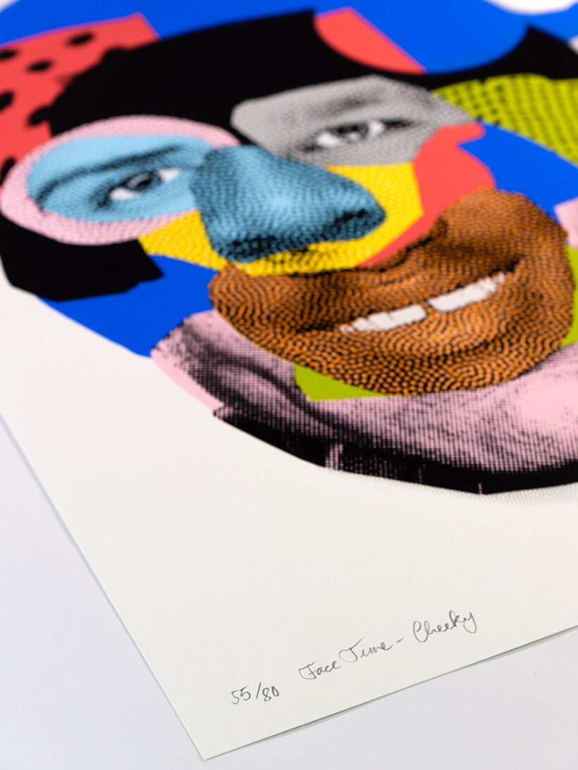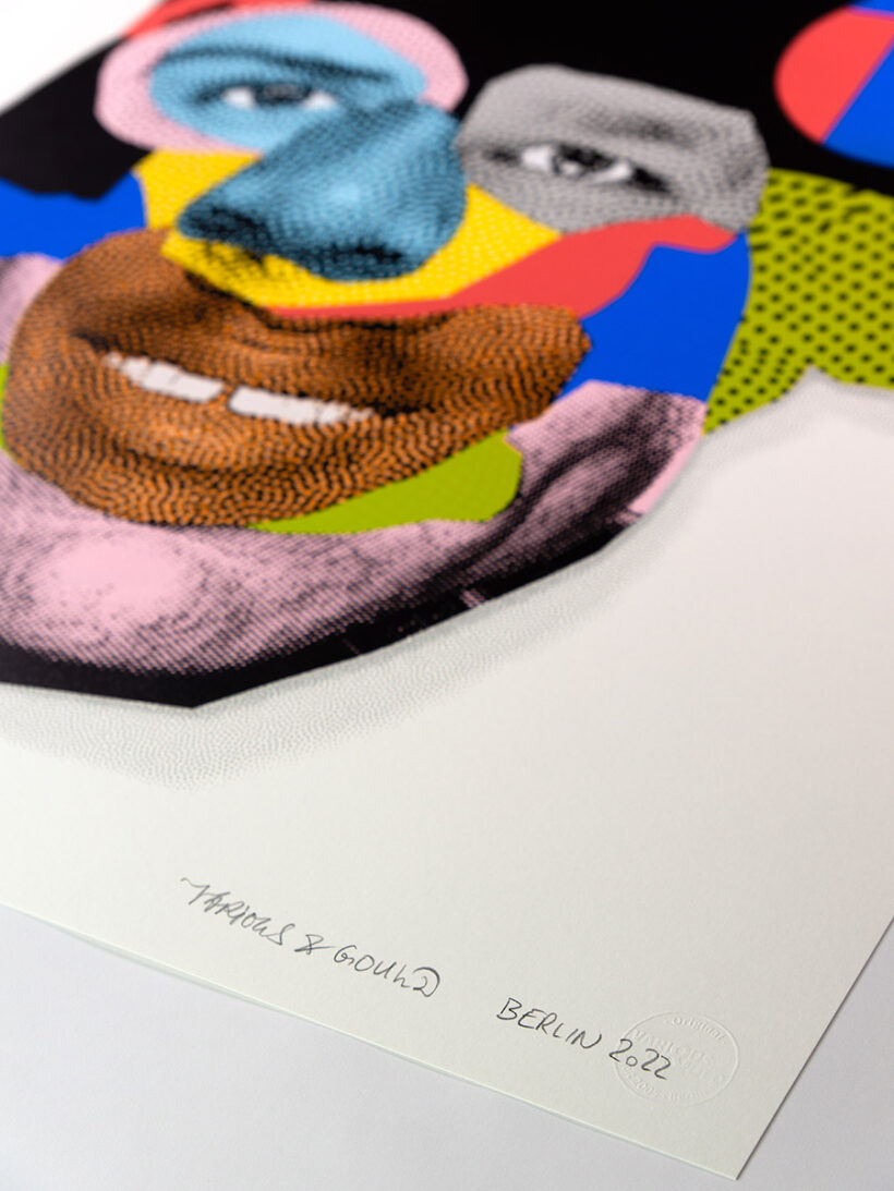 This limited screen print edition is part of the “Face Time” series. The motif is based on a personal favorite collage of the duo, which they pasted up in Hamburg in 2016. Various & Gould reconstructed the lost poster using a photo, reworked the image and transformed it into this print.