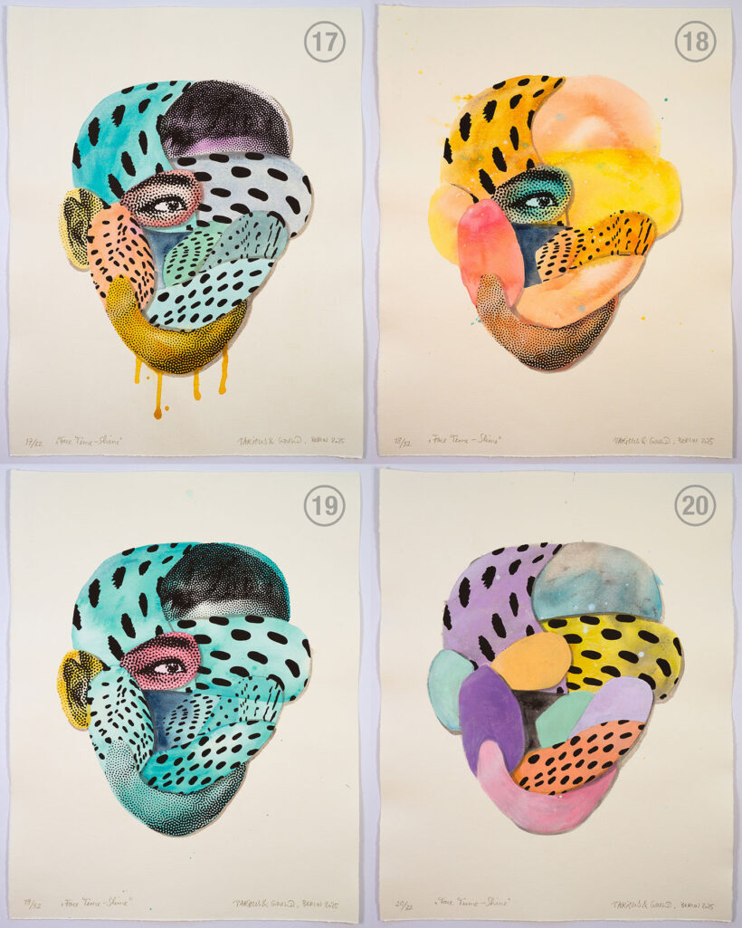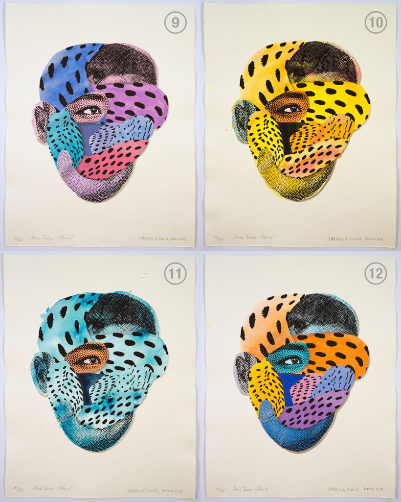 Jedes Exemplar hat eine individuelle Untermalung. Zudem haben wir in den Siebdruckdurchgängen bei manchen Blättern bestimmte Bereiche ausgespart, um das Zusammenspiel von Farbflächen, Rasterpunkten und Motiv noch stärker zu variieren.
